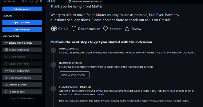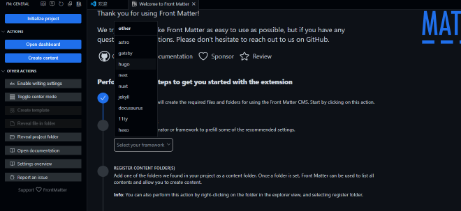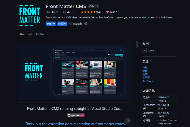 Elio Struyf开发的Front Matter是一款为静态网站设计的CMS系统,其作为Visual Studio Code插件提供,支持多种静态网页框架:Hugo、Jekyll、Hexo、NextJS、Gatsby、Astro。