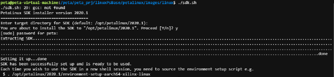 运行安装sdk,提示我们默认安装在/opt/petalinux/2020.1,按回车,然后输入Y,安装在默认目弽,安装完成后,根据提示使用命令