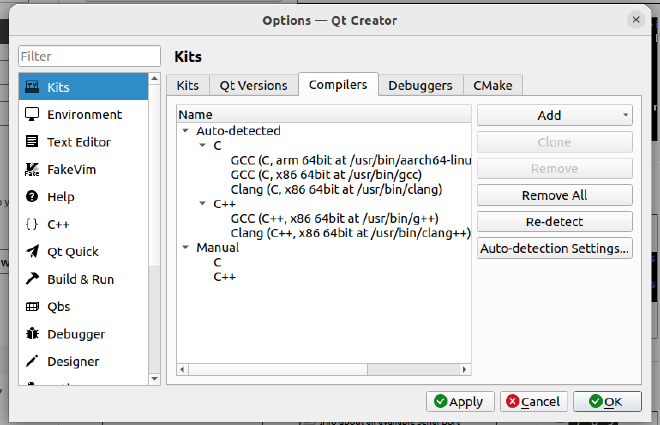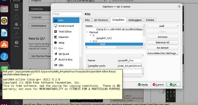 在“Compilers”页面,点击“Add..”,选择“GCC -> C++”,“Name”修改为“zynqMP_C++”,路徂选择“/opt/petalinux/2020.1/sysroots/x86_64-petalinux-linux/usr/bin/aarch64-xilinx-linux/aarch64-xilinx-linux-g++”。
