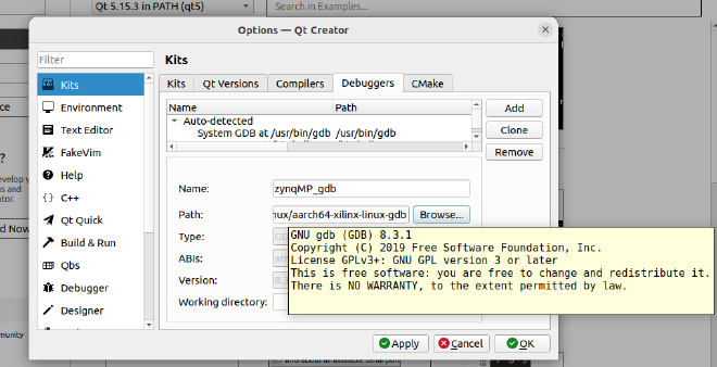 选择“Debuggers”,添加一个,点击“Add”添加一个调试器,名称修改为”zynqMP_gdb”,路徂选择”/opt/petalinux/2020.1/sysroots/x86_64-petalinux-linux/usr/bin/aarch64-xilinx-linux/aarch64 xilinx-linux-gdb”,点击”Apply”。