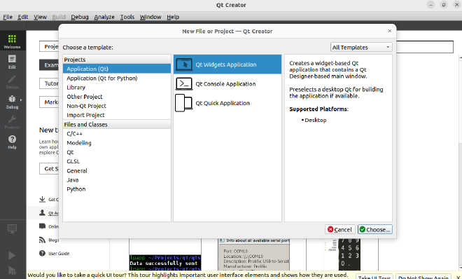 点击File -> New File or Project。工程模板选择“Application”“ Qt Widgets Application”,然后点击“Choose…”。